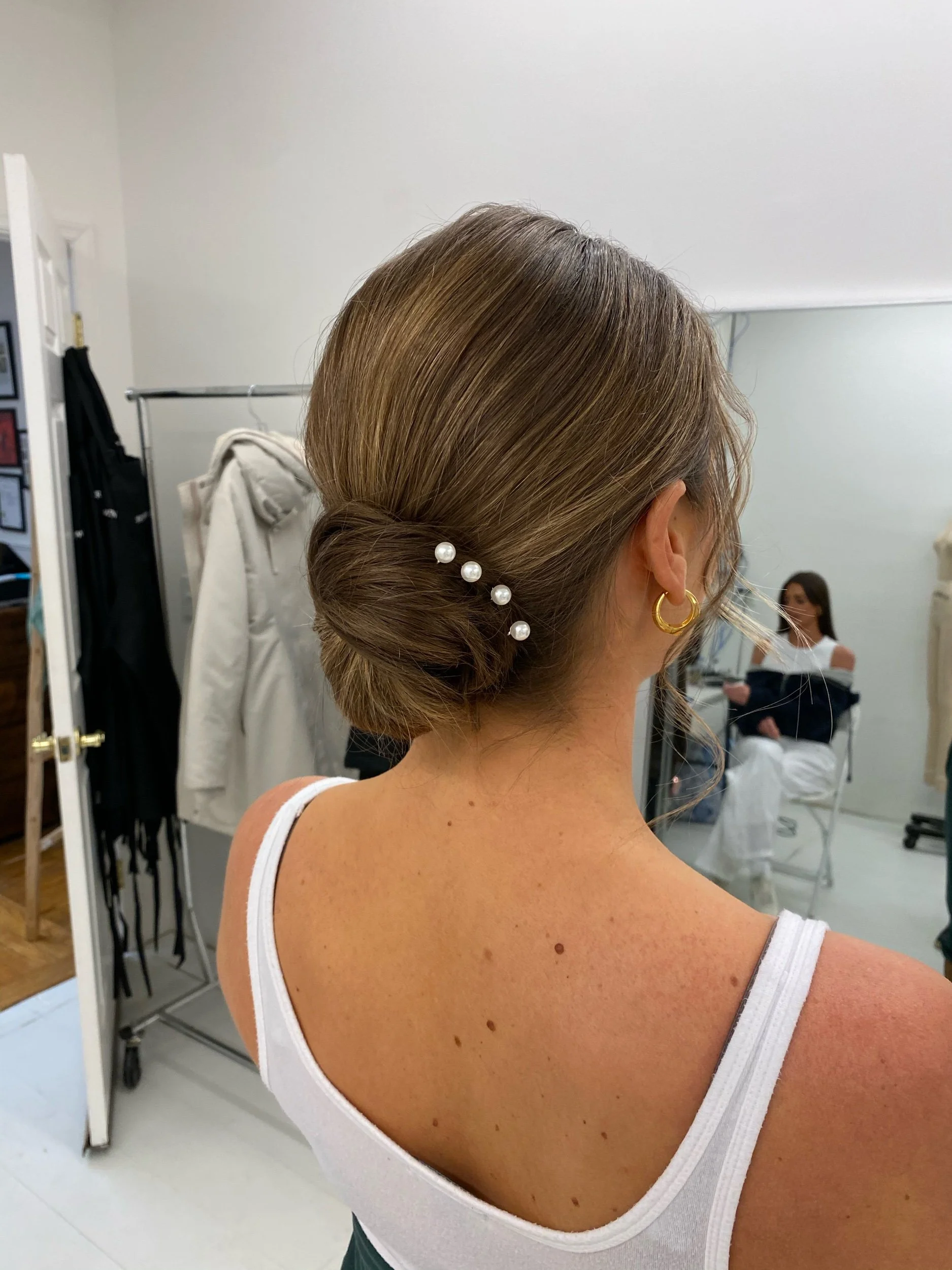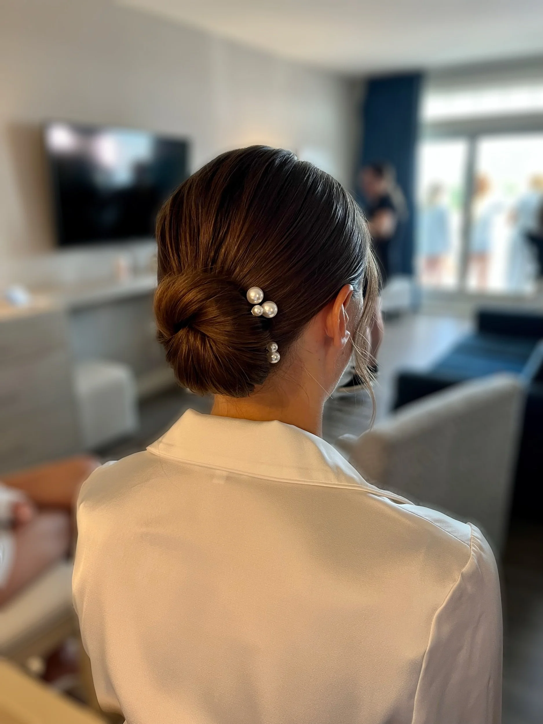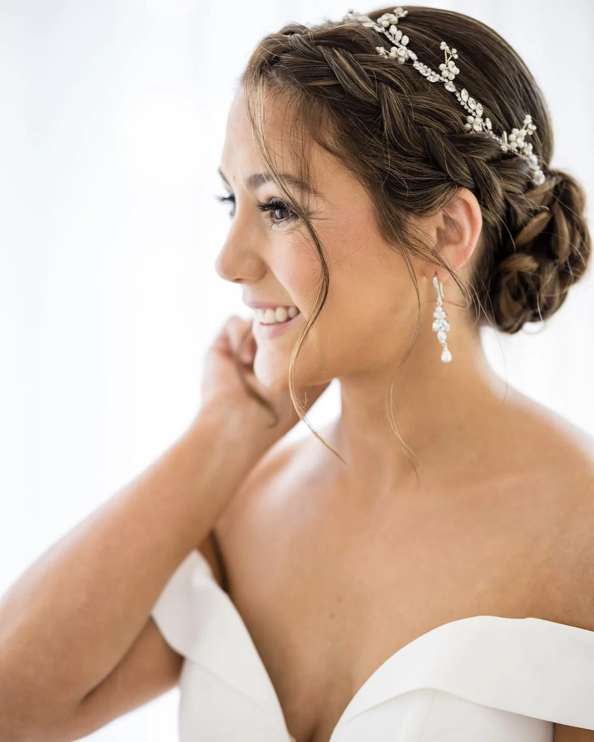 Classic bridal updo hairstyle for Tampa Bay wedding by Becki With the Good Hair featuring braids and pearl hair accessories in humid Florida weather